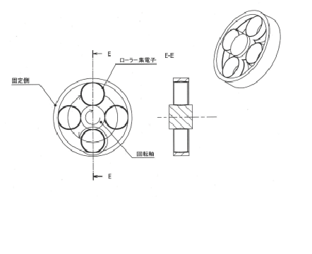 回転軸が回転すると、固定側と回転軸の間のローラ集電子が自転しながら公転する、 いわゆる遊星運動を行います。